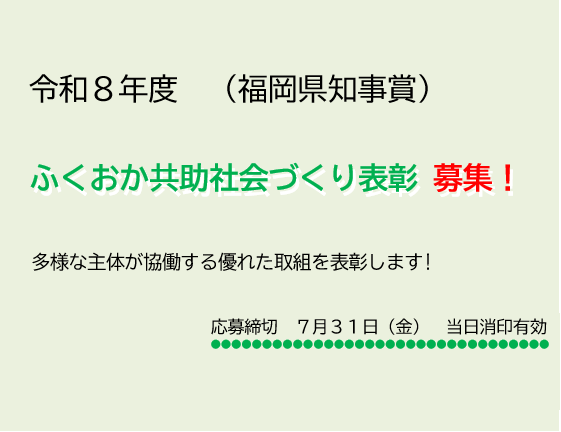 【7/31(金)締切】令和8年度ふくおか共助社会づくり表彰(福岡県知事賞)募集~多様な主体が協働する優れた取組を募集します~NEW